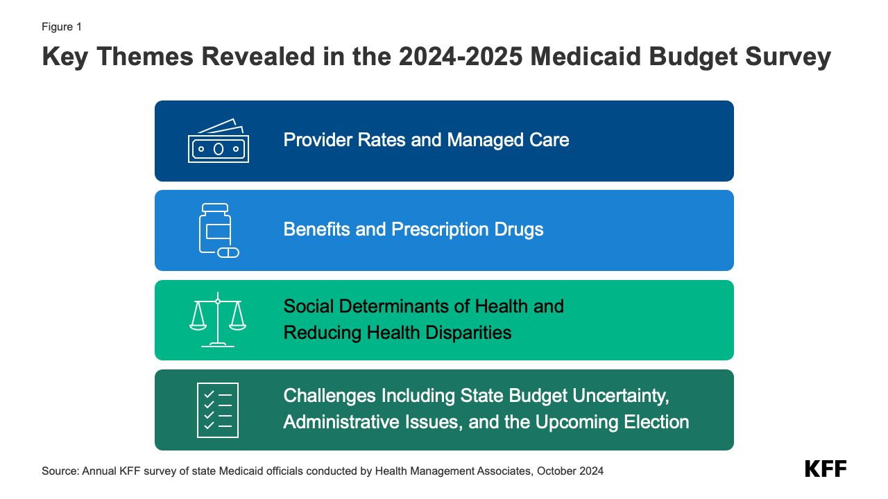 This annual Medicaid budget survey report highlights certain policies in place in state Medicaid programs in state fiscal year (FY) 2024 and policy changes implemented or planned for FY 2025. The findings are drawn from the 24th annual budget survey of Medicaid officials conducted by KFF and Health Management Associates (HMA), in collaboration with the National Association of Medicaid Directors (NAMD).