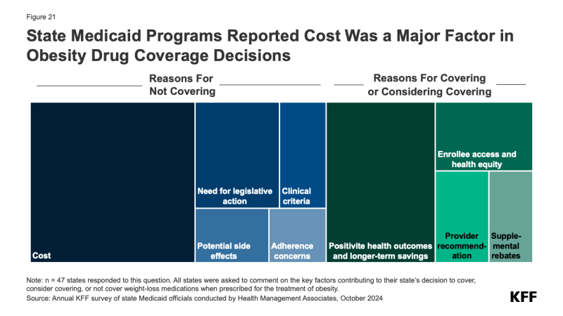 Almost two-thirds of responding states reported that cost was a key factor contributing to their obesity drug coverage decision (Figure 21). A few states mentioned they had conducted or are in the process of conducting studies to assess the cost implications of coverage in their state. A fifth of states also noted the need for legislative action such as changes to the state’s SPA or additional budget appropriations before they could implement coverage of these drugs. In addition, a few states mentioned concerns regarding adherence, developing clinical criteria, and potential side effects in their state’s decision not to cover obesity drugs at this time. Conversely, 4 in 10 states noted that positive health outcomes and longer-term savings on chronic diseases associated with obesity were key factors in their decision to cover or consider covering in the future. A few states also mentioned increasing enrollee access and health equity, recommendations from providers, and ability to negotiate supplemental rebate agreements were important factors.